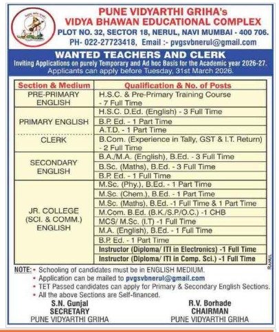 Pune Vidyarthi Gruh भरती 2026 – Pune Vidyarthi Gruh द्वारा प्रसिद्ध केलेल्या जाहिराती नुसार ‘शिक्षक, लिपिक’ पदाच्या ‘31’ रिक्त जागांसाठी अर्ज मागविण्यात येत आहेत. इच्छुक आणि पात्र उमेदवारांनी दिनांक ‘31-03-2026’ पर्यंत अर्ज सादर करावेत. सविस्तर माहितीकरिता कृपया Pune Vidyarthi Gruh मार्फत प्रसिद्ध करण्यात आलेली मूळ जाहिरात (लिंक खाली उपलब्ध आहे) डाऊनलोड करून वाचन करणे आवश्यक आहे.